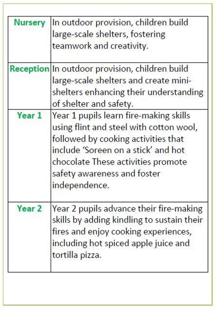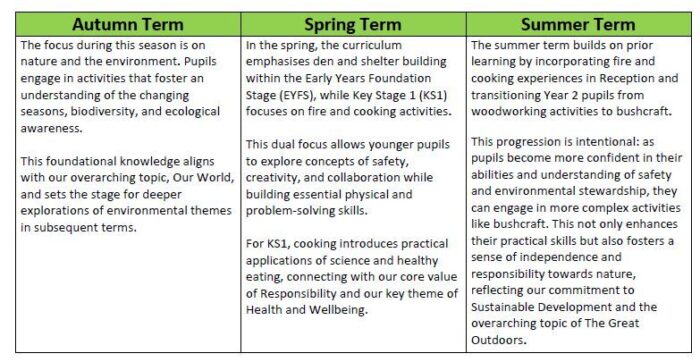 Our Outdoor Learning Enrichment Curriculum is structured around seasonal themes that provide a coherent and progressive framework for learning. This structure is designed to ensure that our pupils can revisit, remember, and build on their knowledge and skills throughout their educational journey.