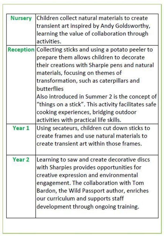While we have integrated many elements of the Wild Passport into our programme, we have selectively chosen the most impactful components to align with our pupils’ specific needs and context. Given our unique challenges, including tight curriculum time and a diverse pupil population, we focus on key areas that foster holistic development and engagement.